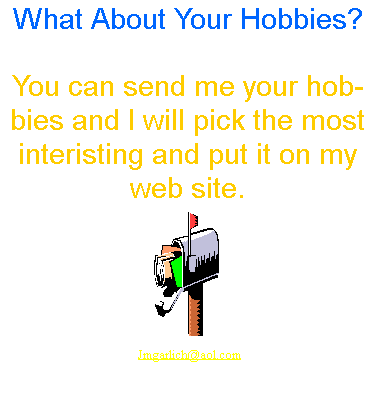 MY HOBBIES ARE PLAYING SPORTS (FOOTBALL, BASKETBALL, GOLF, BASEBALL) ALSO I LIKE TO PARTY, GIRLS (JUST ONE ACTUALLY), MOVIES, AOL, MAKING WEB PAGES, FRIENDS, FOOD, TV, NINTENDO 64. THAT IS ABOUT ALL I HAVE MORE I JUST DON'T WANT TO NAME THEM ALL! |